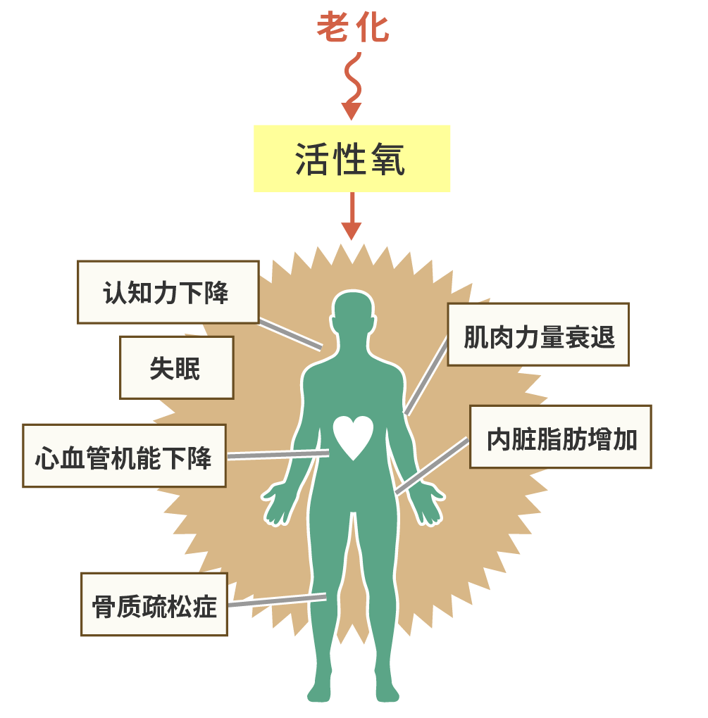 认知力低下、肌肉力量衰退、骨质疏松症、内脏脂肪增加、心血管机能低下、失眠等,这些都是随着年龄的增加让人烦恼的症状。而作为医学上的变化项目,主要原因分别是氧化应激、免疫应答、持续性炎症、昼夜周期、自律神经系统的不协调等。
