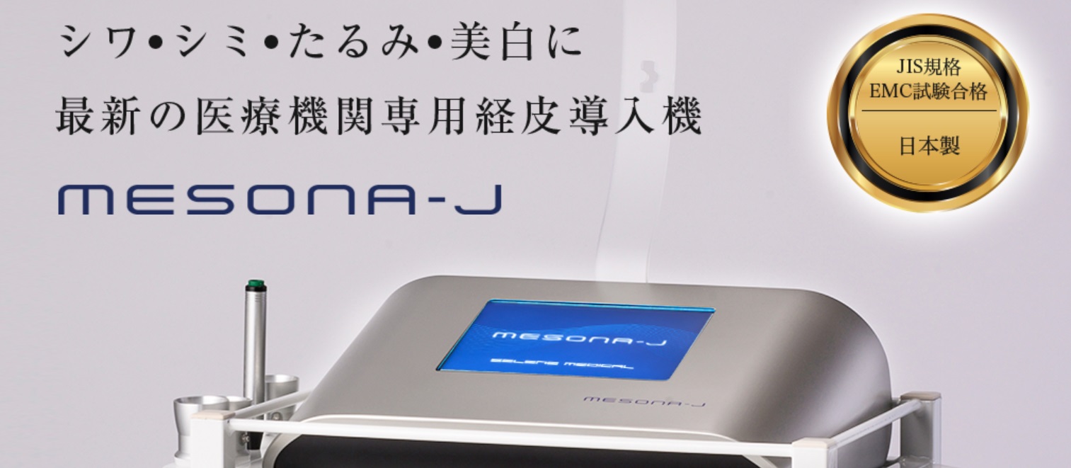 メソナJは医療機器に求められる厳しい品質規格(JIS規格、EMC試験等)にも合格している医療機関専用の国産経皮導入機です。メソナJを用いると、ヒアルロン酸のような高分子成分でも皮膚に傷をつけることなく真皮層にまで届き、細胞に直接作用するため、注入法を用いたかのような効能を発揮します。痛みもなくダウンタイムもないのが特徴です。